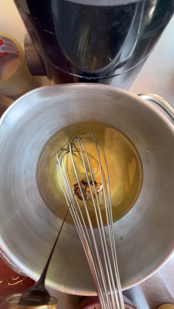 En un bol mesclamos el agua con la miel (o el azúcar). Unimos también la pizca de sal, la vainilla y el aceite.