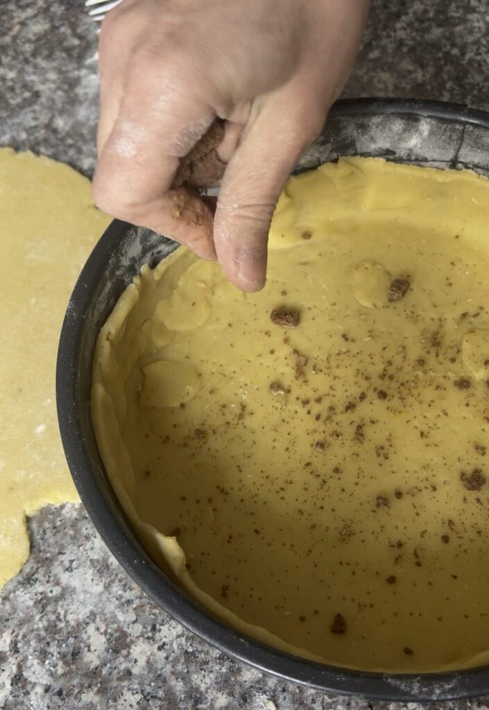 Tapamos nuestro pastel con la capa de pasta frolla, unimos bien los bordes y cortamos los excesos a nivel.