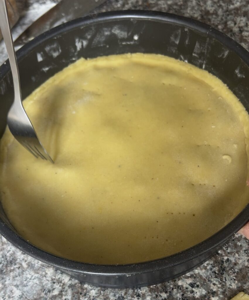 Seguimos haciendo unos huecos con el tenedor en la superficie y horneamos a 180 grados por 35-40 minutos máximo. La masa tiene que salir dorada.