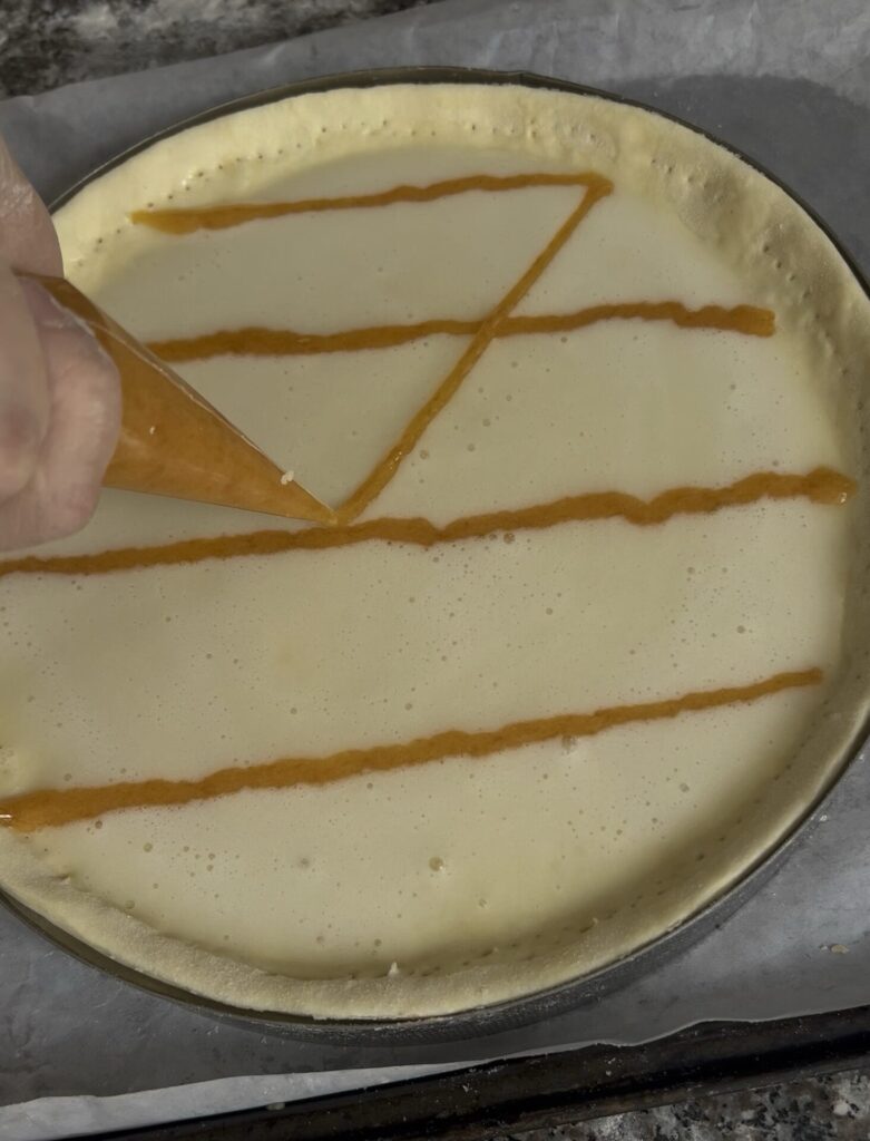 Terminamos cubriendo la tapa de hojaldre con el glaseado y, con un poco de mermelada puesta adentro de una manga pastelera, decoramos la superficie.