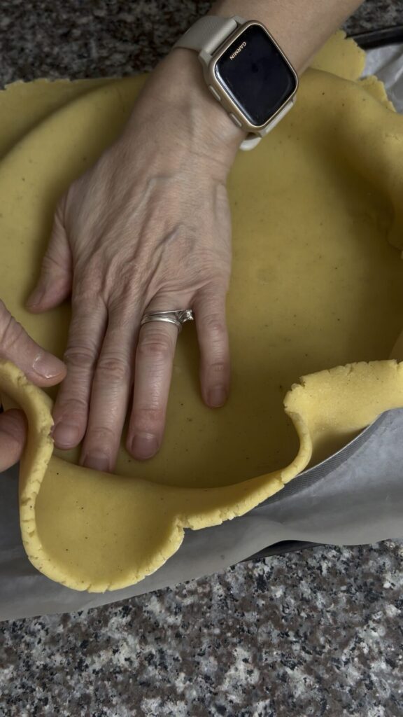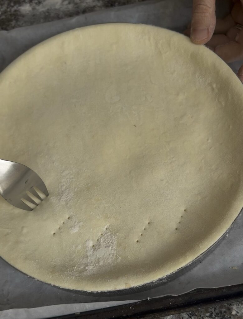 Terminado el descanso, extendemos la masa de pasta frolla en un espesor de 1 mm y la ponemos en un molde untado y enharinado en los bordes y con papel encerado en la base, dejando unos bordes de 2 cm (Si unan un ring como el mío, solo seria suficiente untar un poco los bordes).