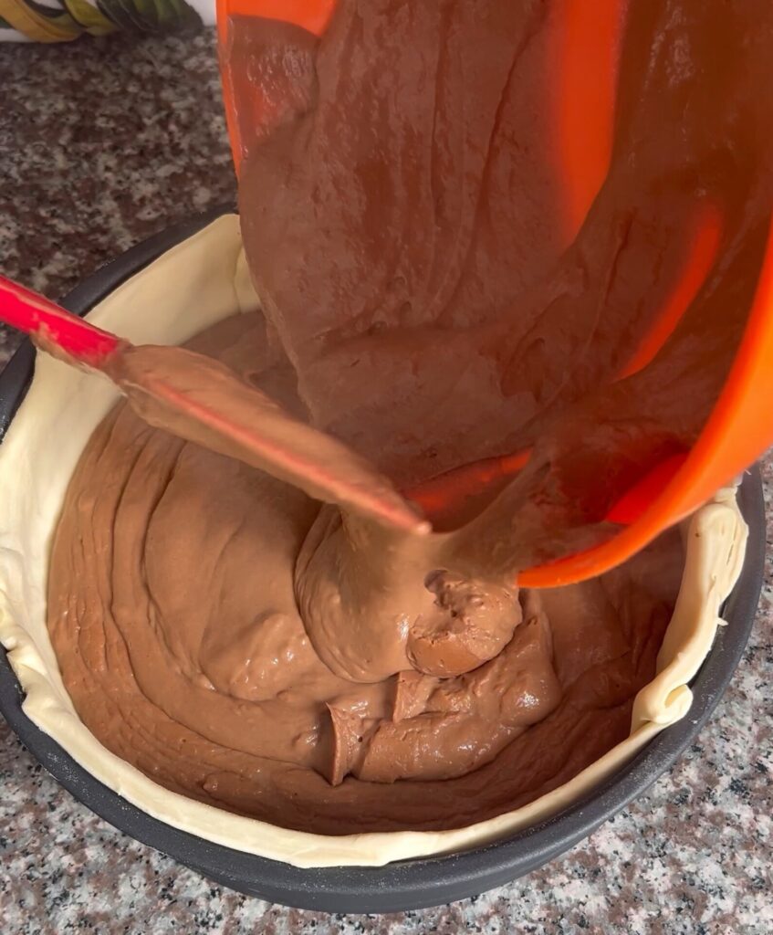 Vertamos nuestra crema adentro de nuestro molde con masa de hojaldre, cortamos el exceso de masa con un cuchillo dejando un dedo de borde desde la crema y horneamos a 180 grados por 30 minutos.