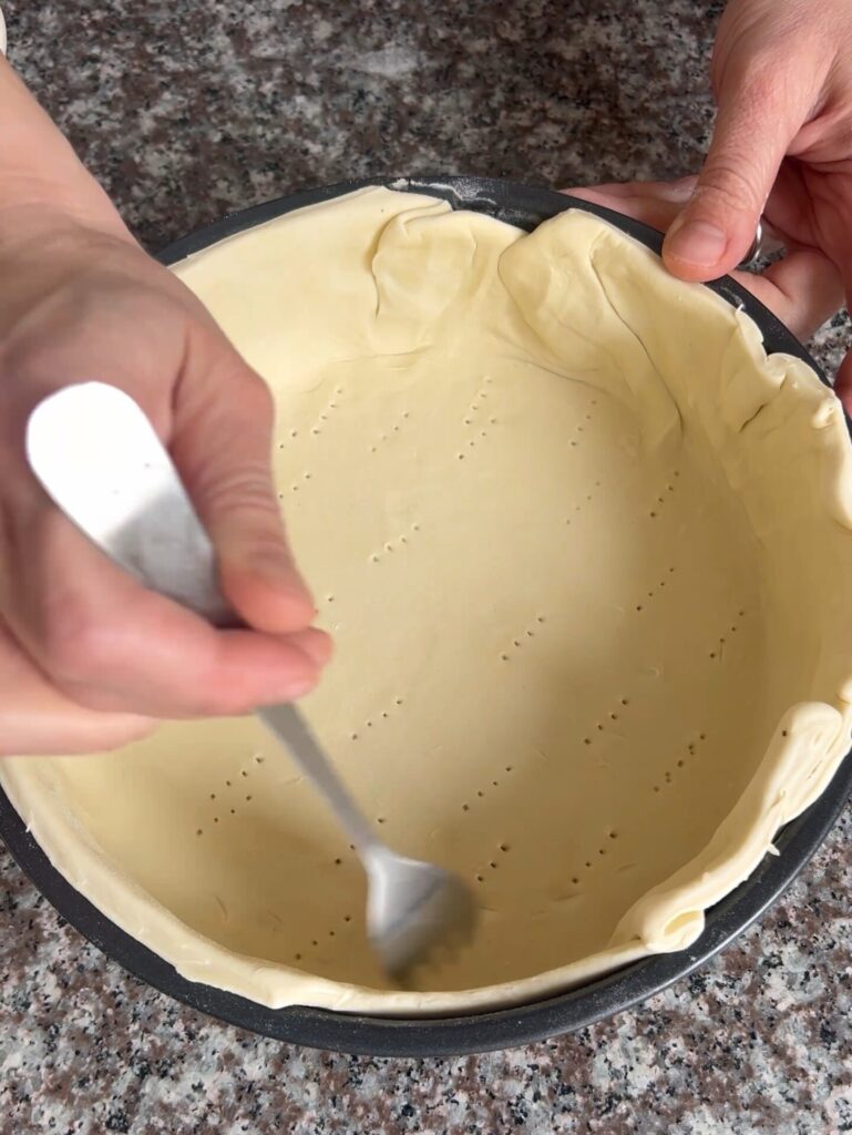 Empezamos extendiendo la masa de hojaldre hasta un espesor de dos milímetros (este proceso solo es para quien no encuentra la masa ya redonda y lista!) y la ponemos dentro de un molde untado y enharinado. Cortamos los excesos que salen del molde, con un tenedor hacemos unos huecos en la base y ponemos en la refrigeradora.