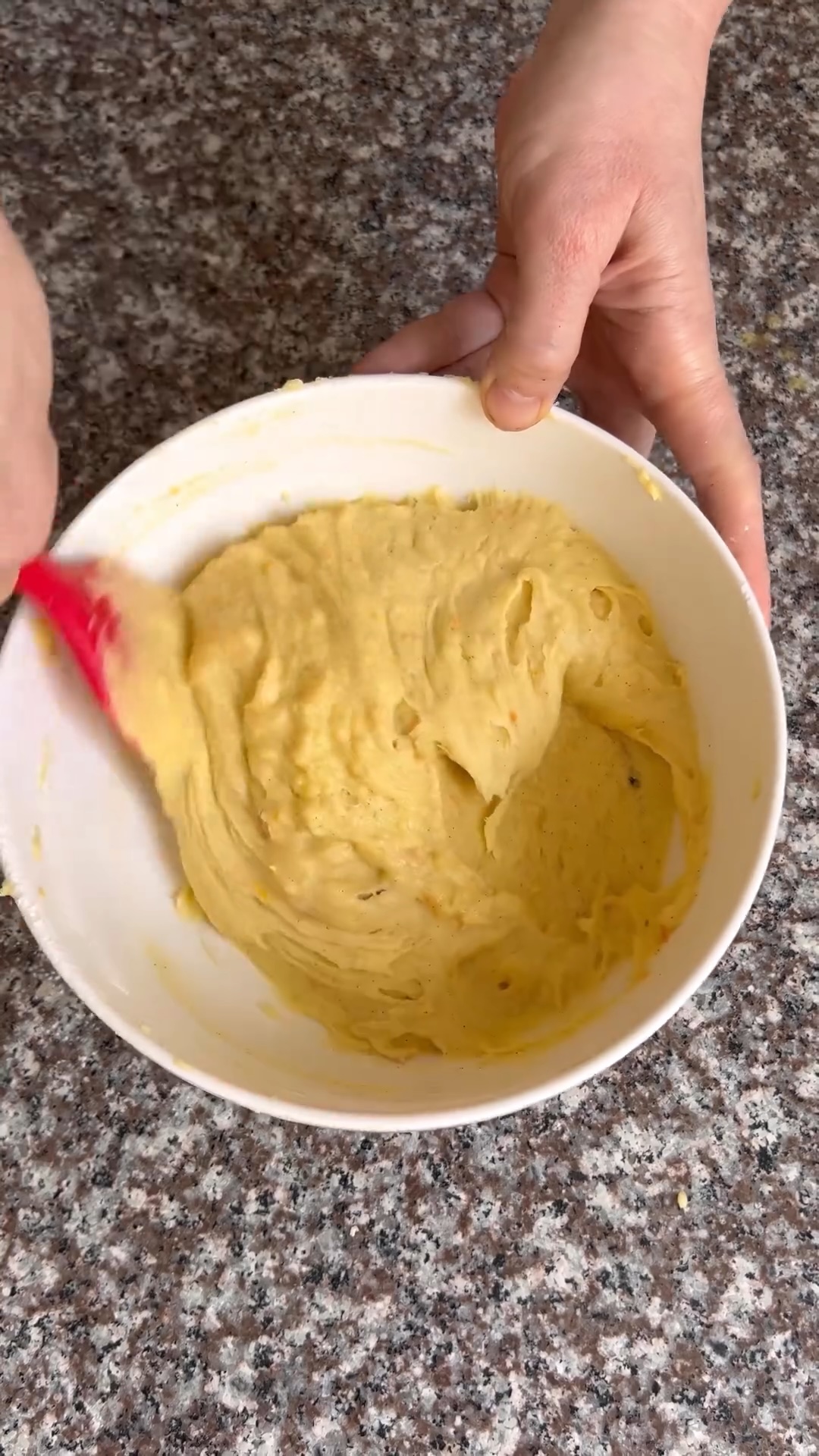 Tamizamos la harina y la levadura y unimos a la mezcla usando una espátula hasta obtener una masa lisa que se parece a una purea.