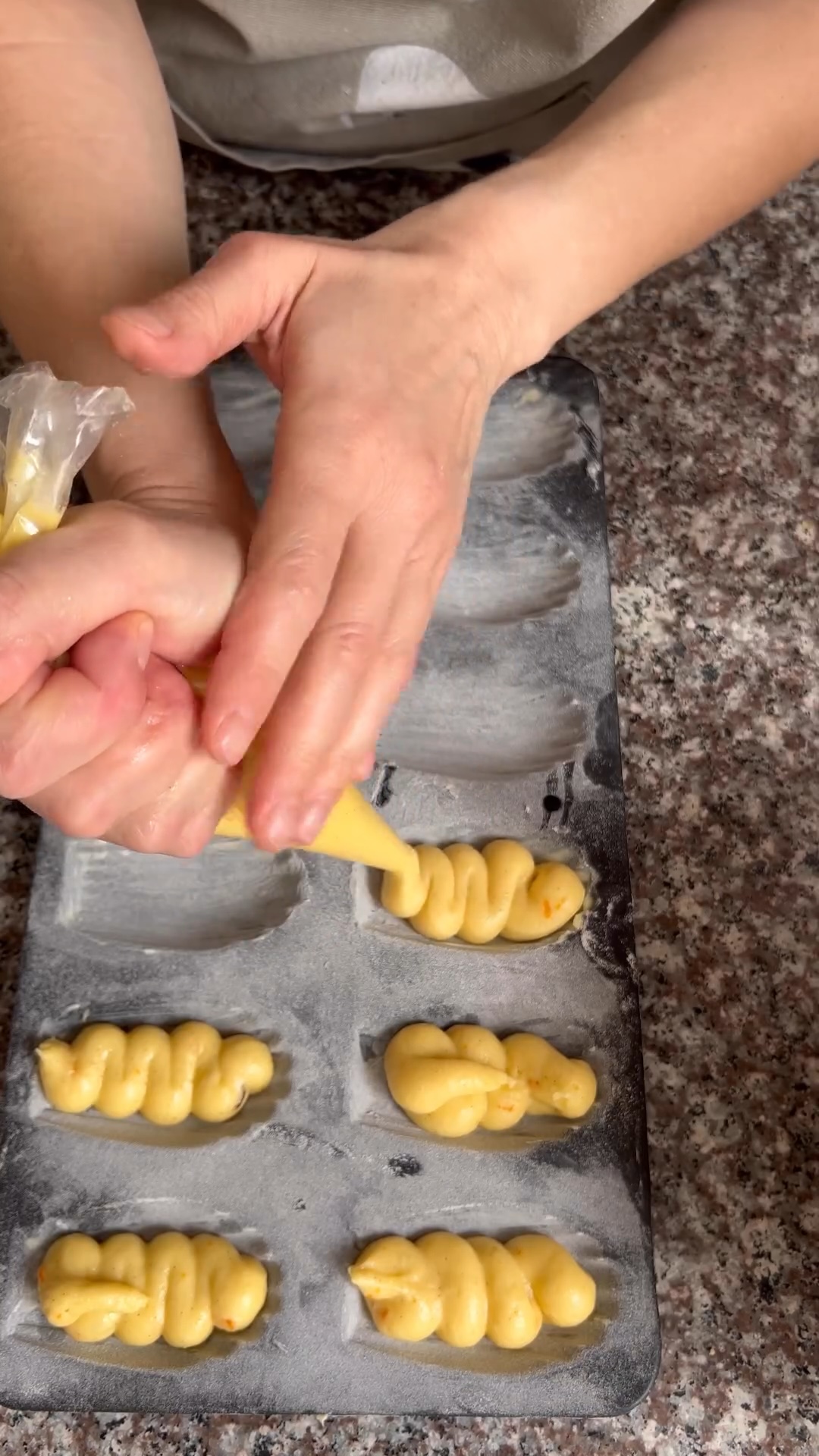 Una vez terminando el tiempo de descanso, calentamos el horno y ponemos la crema de nuestras madeleine en una manga pastelera. No la rellenamos mucho para tener mayor movilidad con las manos. Esto porqué la masa estará muy fría y necesitamos de aplastar bien la manga pastelera para que salga la masa.