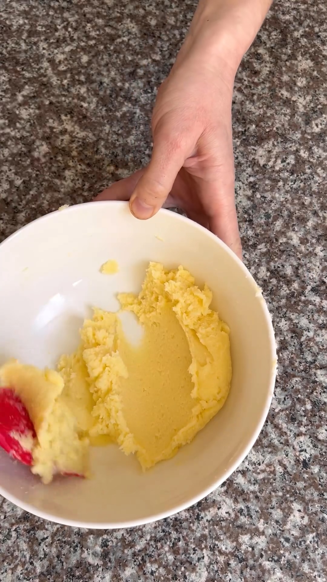 Con una espátula trabajamos la mantequilla con el azúcar hasta que estén bien mezclados. Unimos los huevos uno a la vez mezclando bien antes de anadir el otro.