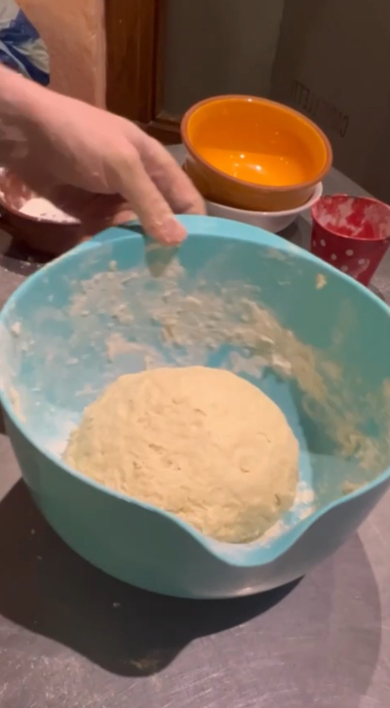 Empezamos resolviendo la levadura en agua tibia con el azúcar. En un bol ponemos las dos harinas y unimos el agua con la levadura, poco a la vez. Seguimos trabajando y añadimos también la manteca de cerdo y la sal.