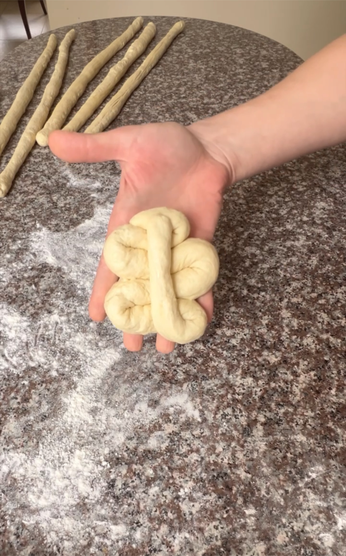 Luego del descanso podemos formar nuestros panes haciendo primero unos tubitos de 45 cm de largo y luego enrollando hasta dar la típica forma.