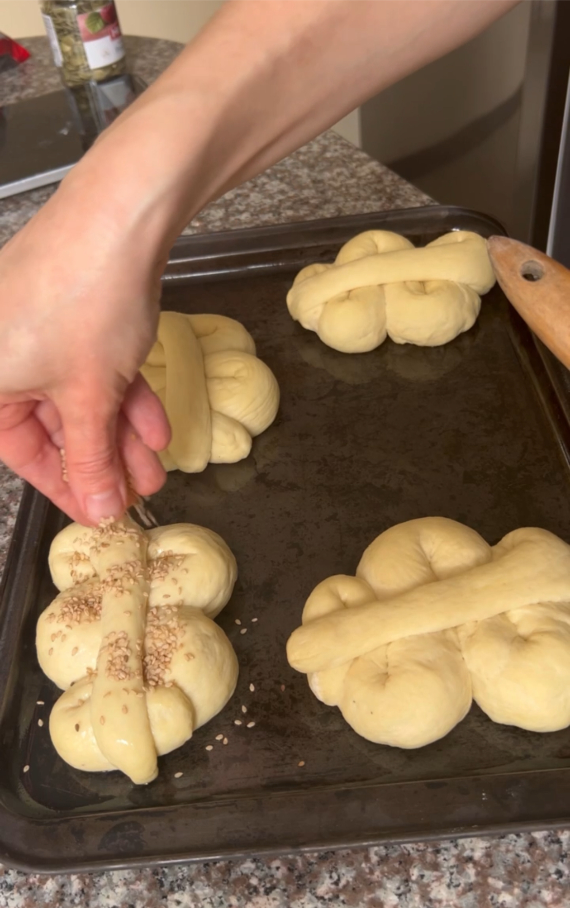 Ponemos nuestras mafaldas en un molde para hornear untado con aceite. Dejamos descansar unos 40 minutos y luego mojamos con agua la superficie y decoramos con ajonjolí.