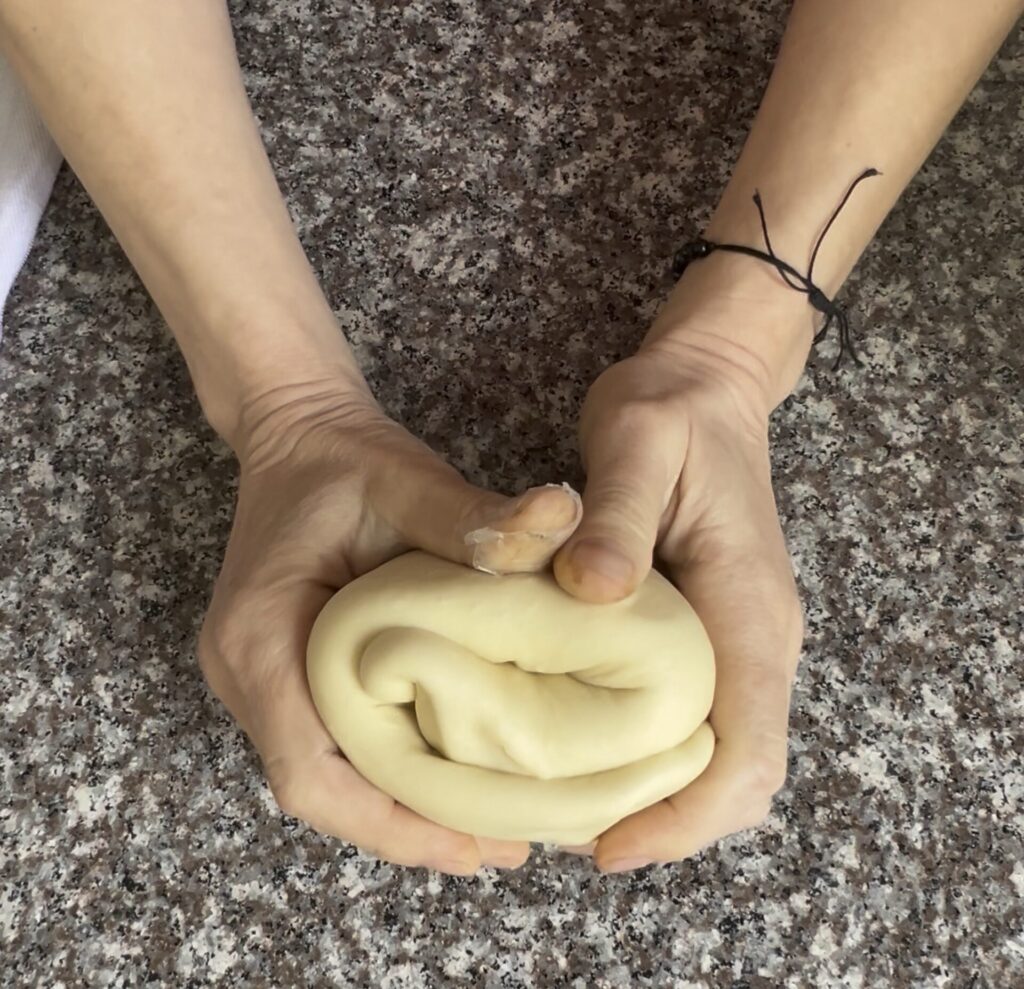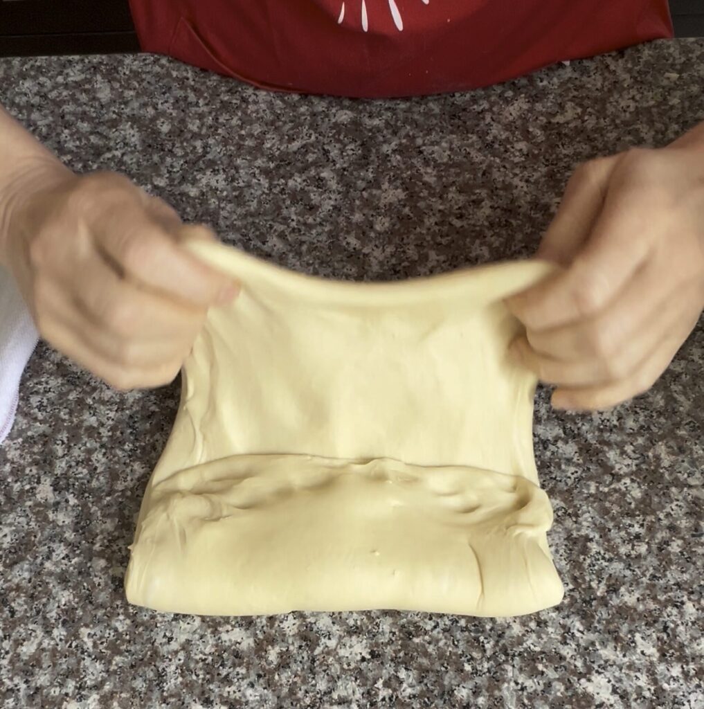 Una vez bien amasada la masa, en el mesón de trabajo daremos el primer pliegue. Abrimos la masa en un rectángulo y plegamos la extremidad de un lado y del lado opuesto hacia el centro. Damos la vuelta y hacemos lo mismo con los otros dos lados opuestos.