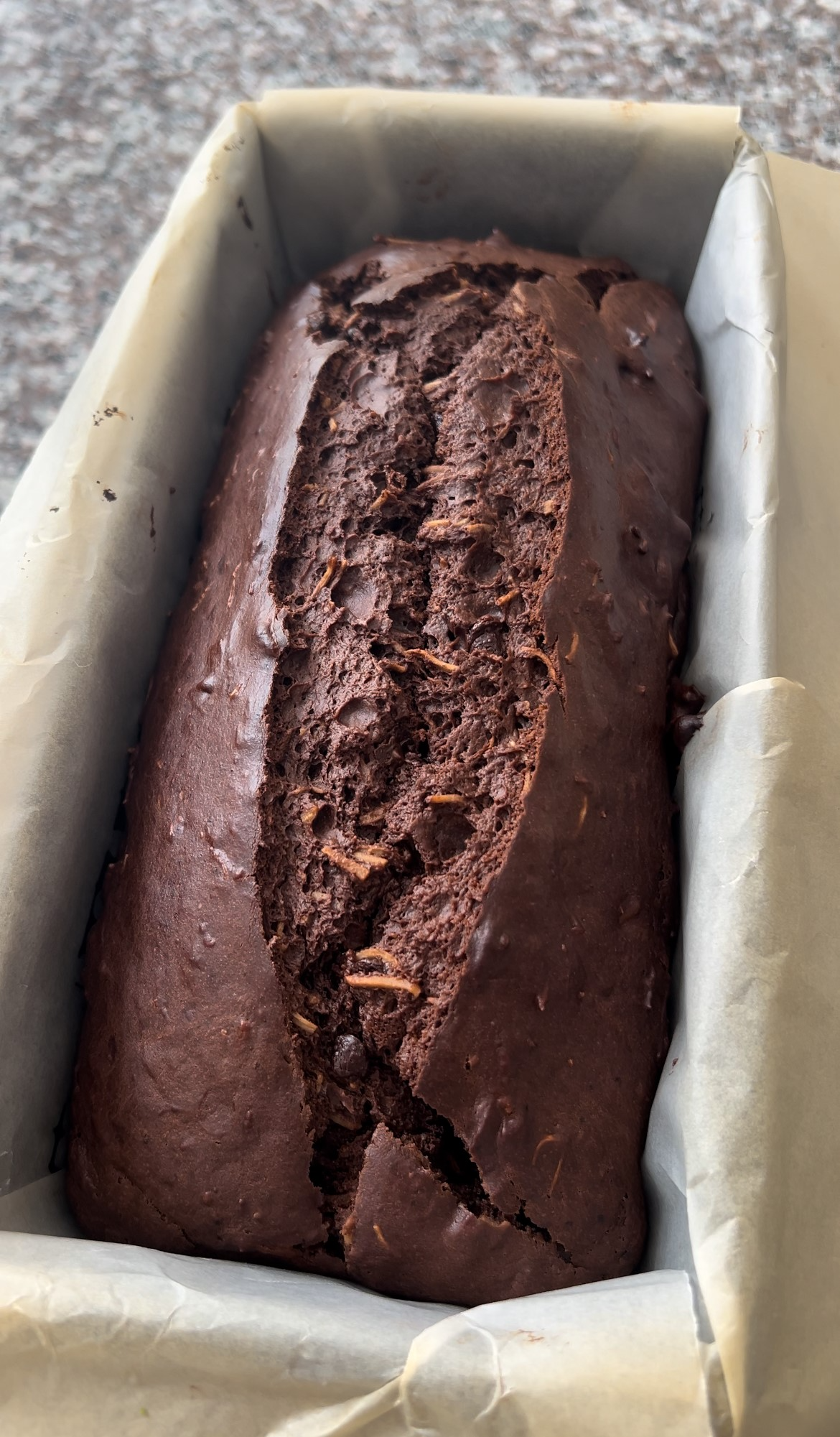 Versamos la mezcla en un molde para plumcake envuelto en papel encerado. Distribuyamos bien y hacemos con un cuchillo un corte en el medio.