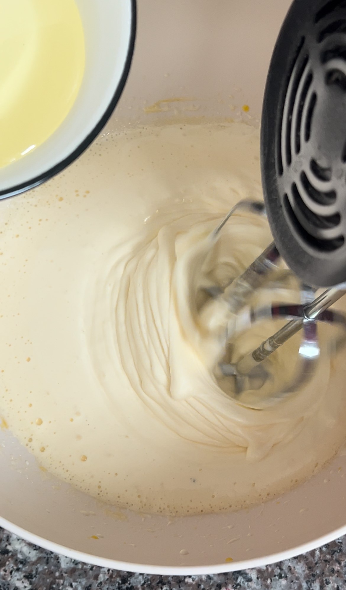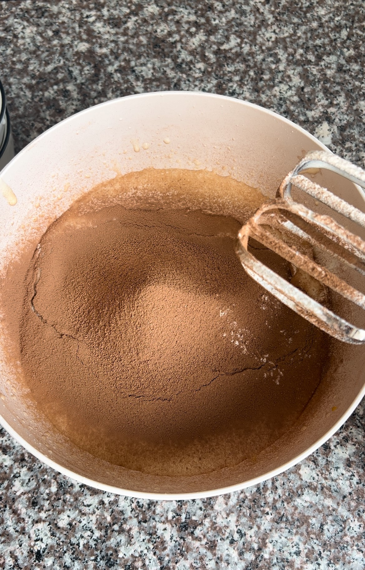 Montamos los huevos con el azúcar hasta obtener una mezcla bien espumosa. Añadimos primero los líquidos y luego la harina, el cacao y el polvo de hornear tamizados.