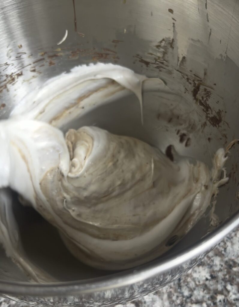 Unimos ahora el chocolate derretido que debe estar a una temperatura inferior a 45 grados, para evitar que se disuelva la mantequilla y una vez bien amalgamados dejamos de batir.