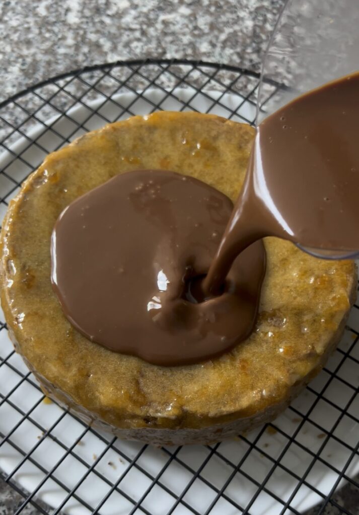 Calentamos 50 gr de chocolate con una cuchara de leche y decoramos nuestro pastel con su típica decoración “Sacher” escrita encima del pastel.