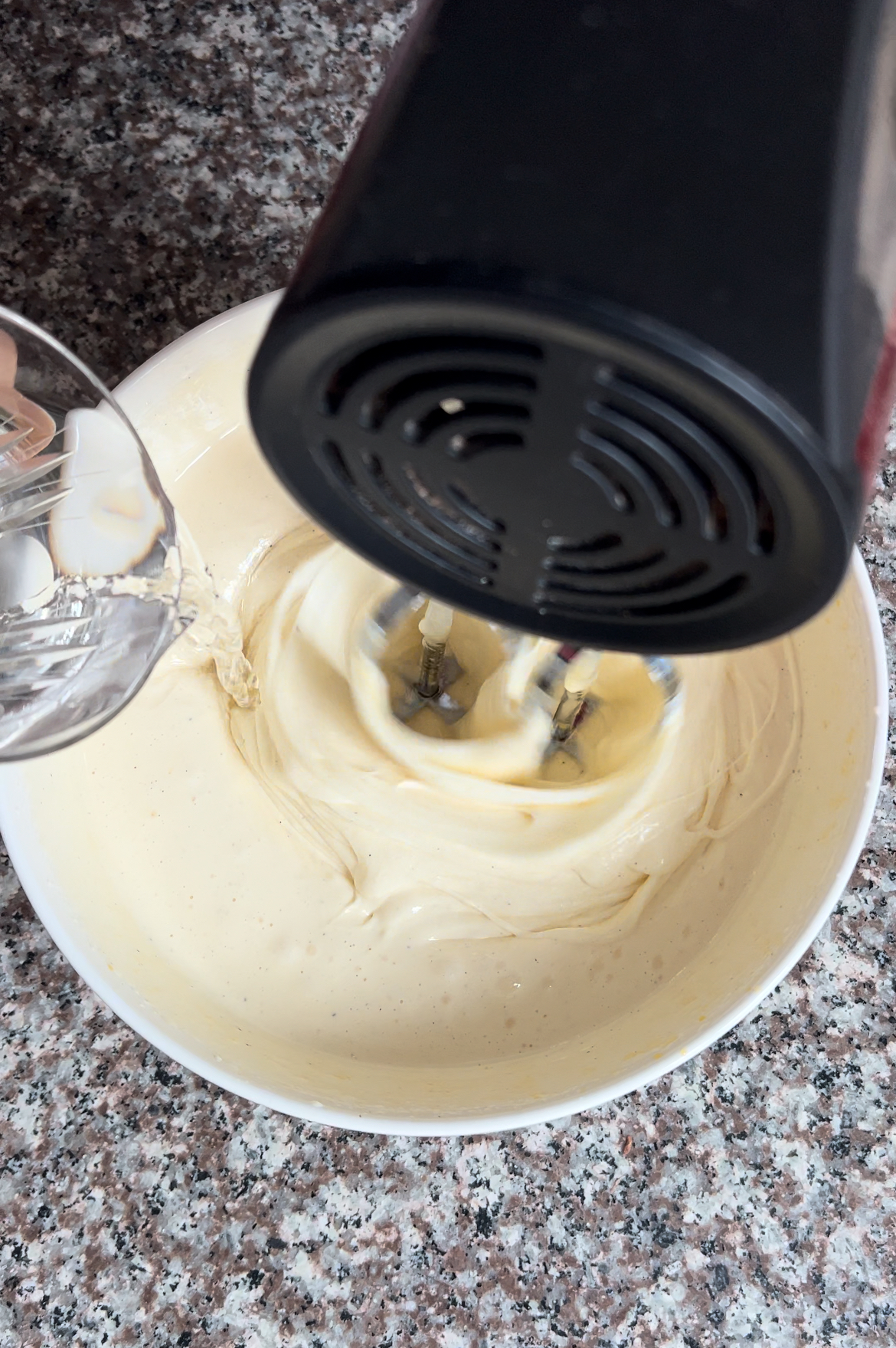 Montamos los huevos con el azúcar y la vainilla por unos 5 minutos. Cuando estarán bien esponjosos, unimos despacio el agua y el aceite.