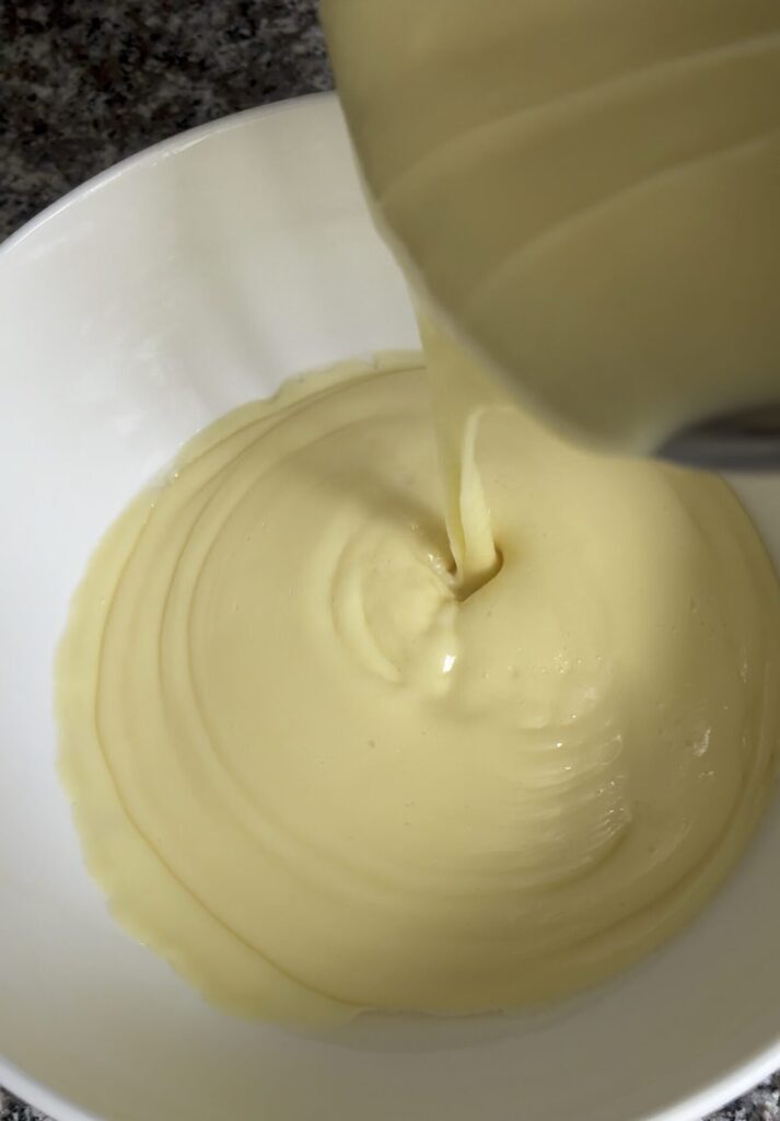 Unimos a la mezcla de huevos la leche caliente filtrándola para sacar la cascara de limón, y volvemos a poner en el fuego. Calentamos hasta que la crema se haga densa, la vertamos en un recipiente, tapamos con film plástico a contacto y dejamos enfriar a temperatura ambiente.