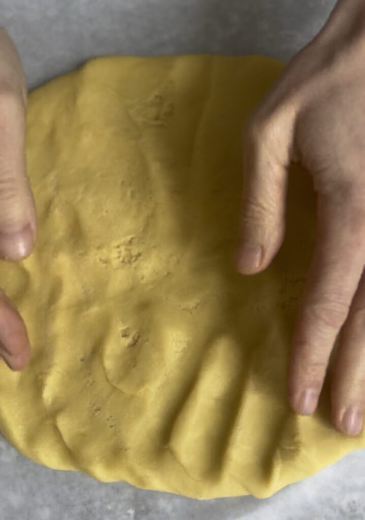 Unimos los huevos y mezclamos hasta obtener una masa bien amalgamada y compacta. Trabajamos un poco, la ponemos en el medio de dos hojas de papel encerado, un poco aplastada, y a descansar adentro de la refrigeradora por lo menos una hora.