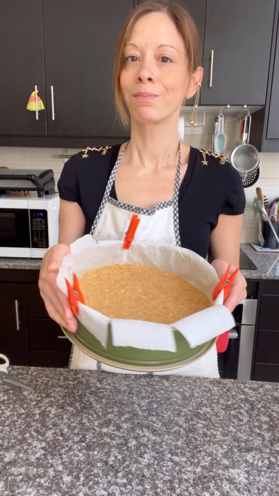 Empezamos transformando en harina las galletas. Les ponemos en el fondo de un molde en el cual alrededor hemos puesto papel encerado, vertamos la mantequilla, mezclamos y aplastamos bien la base de galletas para el fondo de nuestro pastel.