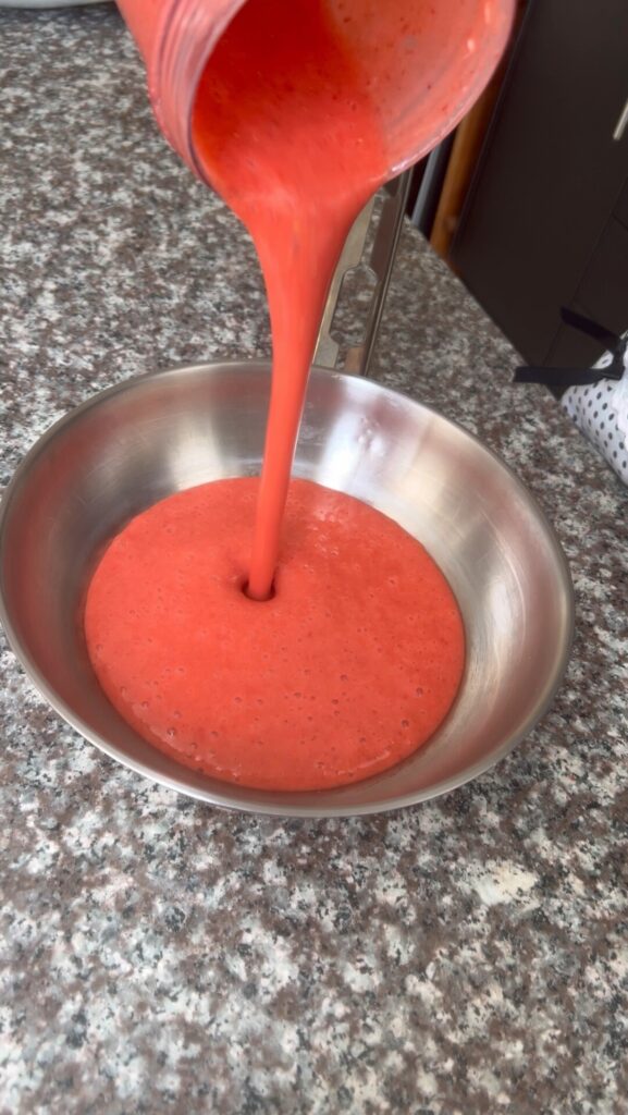 Mientras cocina hacemos la crema. En un procesador o licuadora ponemos la frutilla, el almidón de maíz, el zumo de un limón y el azúcar impalpable, Procesamos hasta obtener una crema.