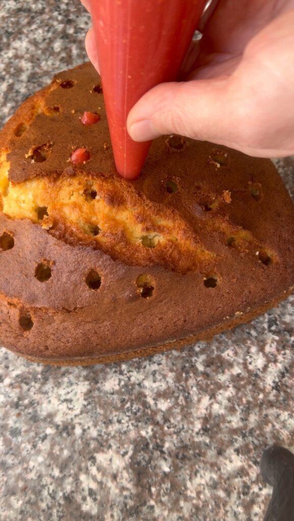 Una vez sacado el pastel del horno, de caliente le hacemos unos huecos en la superficie sin llegar hasta el fondo del pastel. Rellenamos cada hueco con la crema de frutilla.