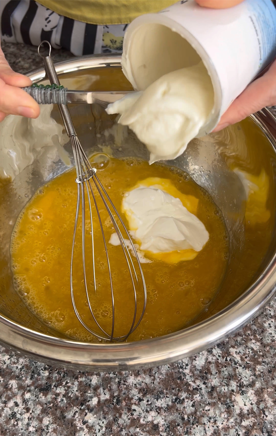 En un bol mezclamos los huevos con la sal. Unimos el vasito de yogurt y el recipiente no le vamos a botar porque será nuestro medidor para los otros ingredientes.