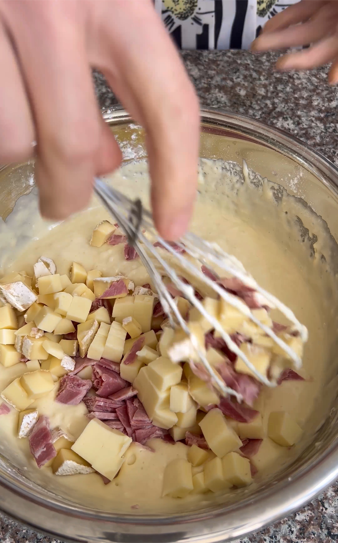 Ahora es el momento del relleno, entonces añadimos también el Parmigiano rallado, el jamón y los quesos hecho todo en cubitos.